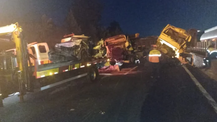 O primeiro caminhão, carregado com telhas de fibrocimento e pisos, colidiu na traseira da Fiat Strada, que acabou prensada contra um segundo caminhão caçamba que prestava serviço para a concessionária Motiva.