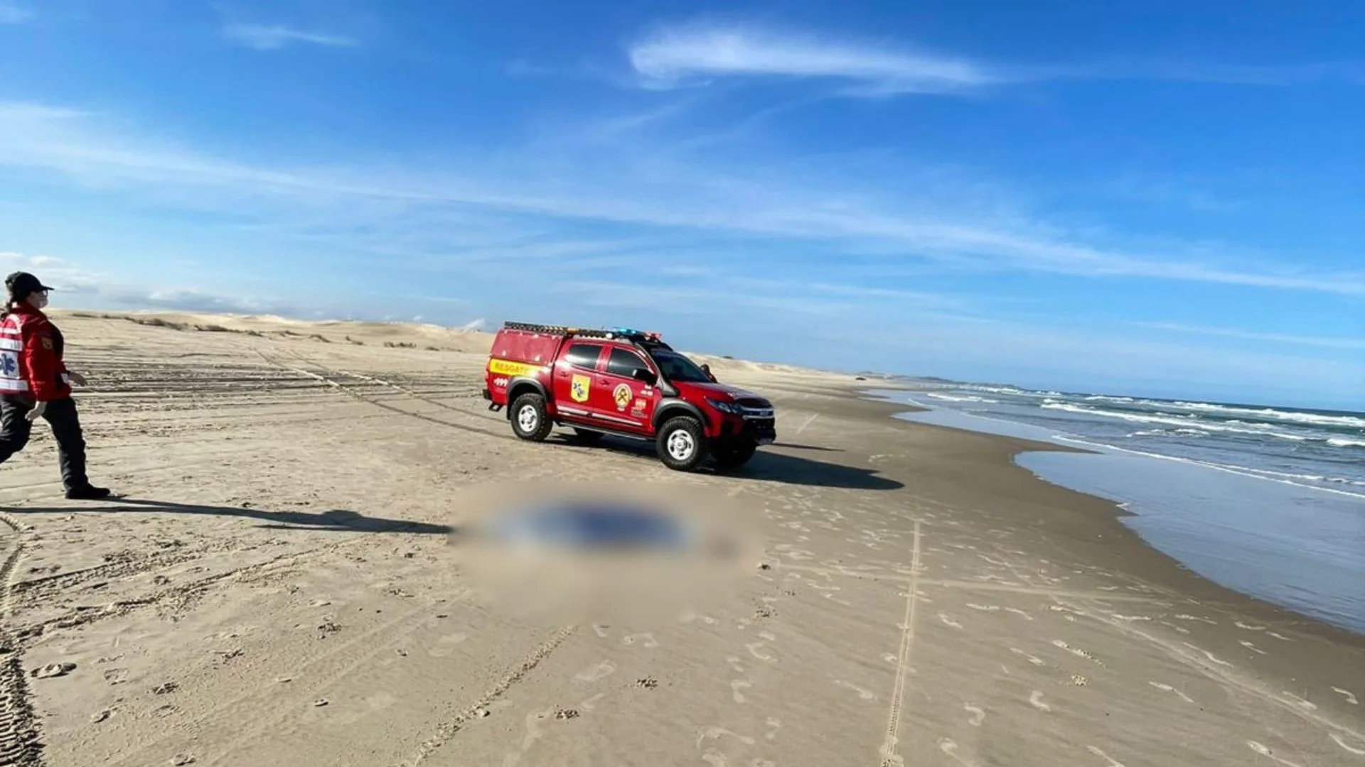 No local, os Bombeiros encontraram um homem de 33 anos deitado de barriga para cima na faixa de areia e inconsciente, após um possível afogamento. A vítima estava sem sinais vitais.
